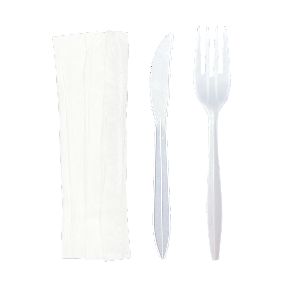 A medium-weight, polypropylene material cutlery kit that features a fork, knife, and napkin. This item is white in color, disposable, and great for all Food Service environments.