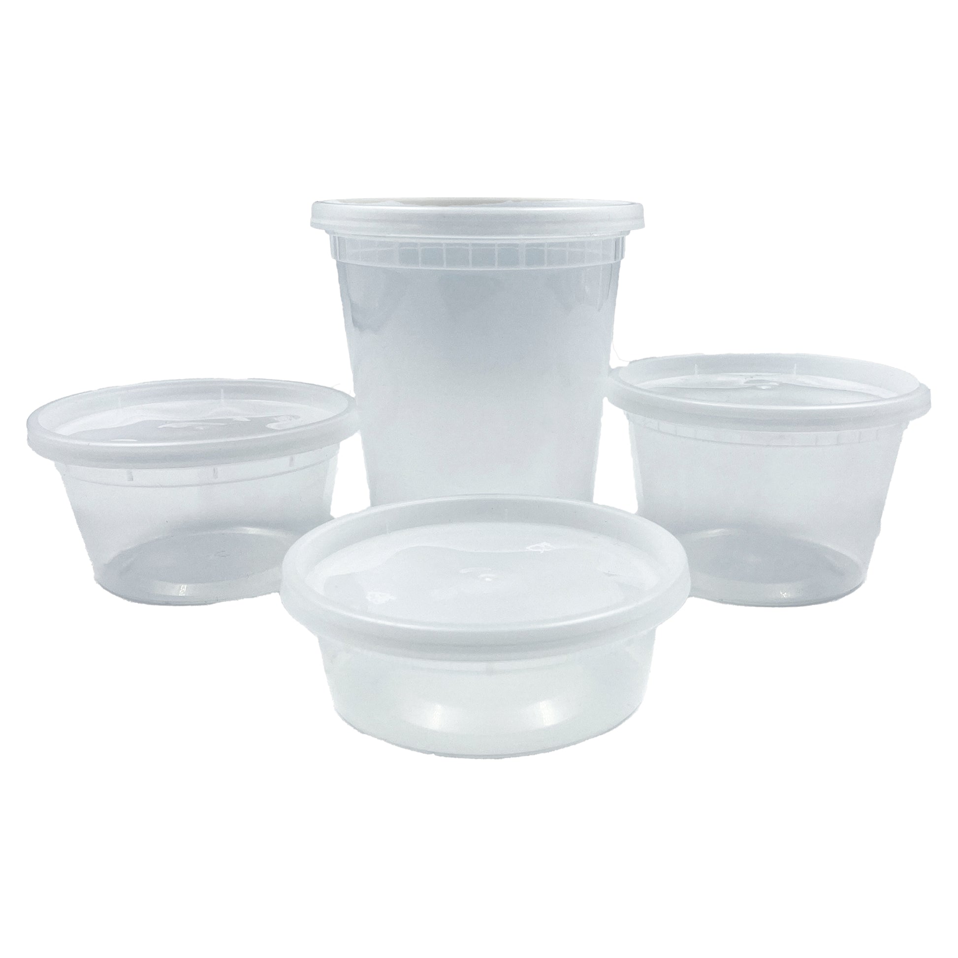 Deli Containers and Lids are available in sizes of 8oz, 12oz, 16oz, and 32oz.