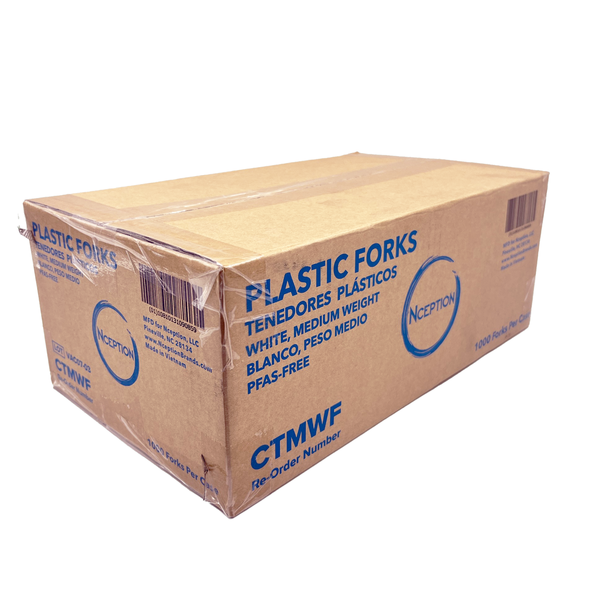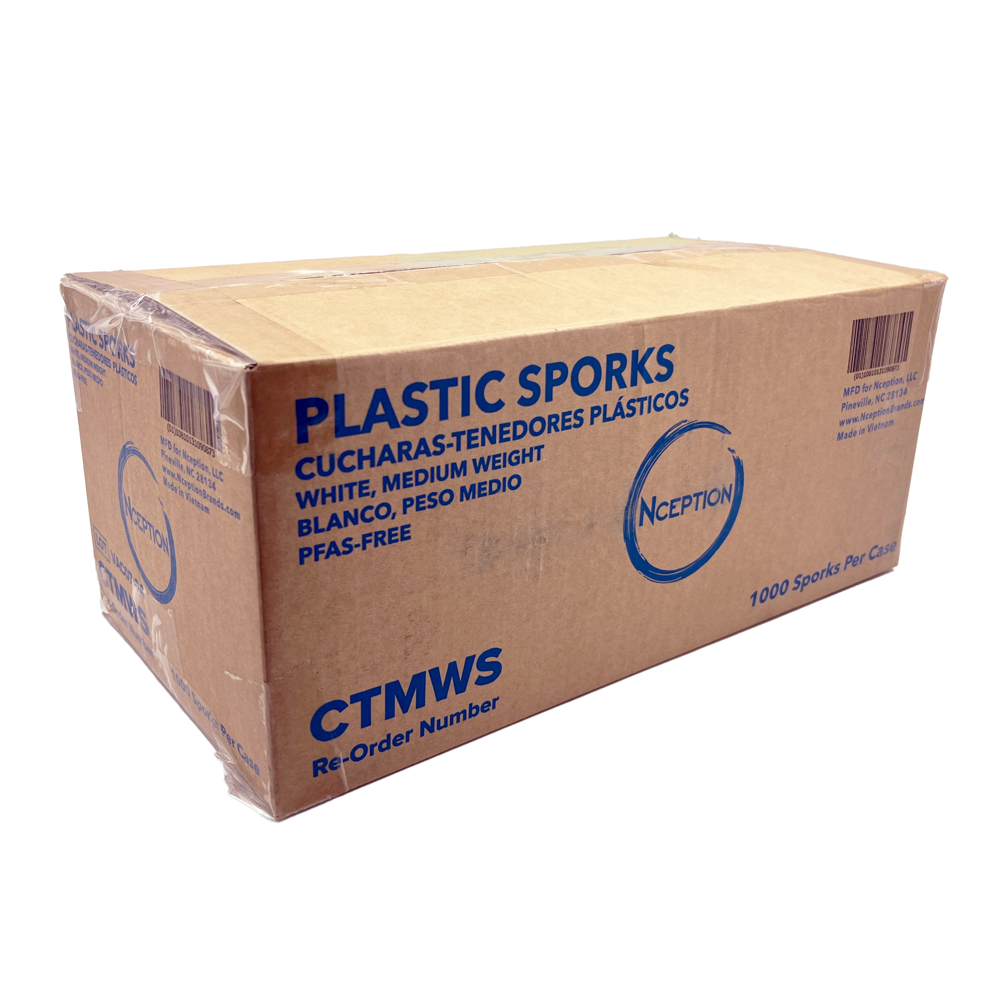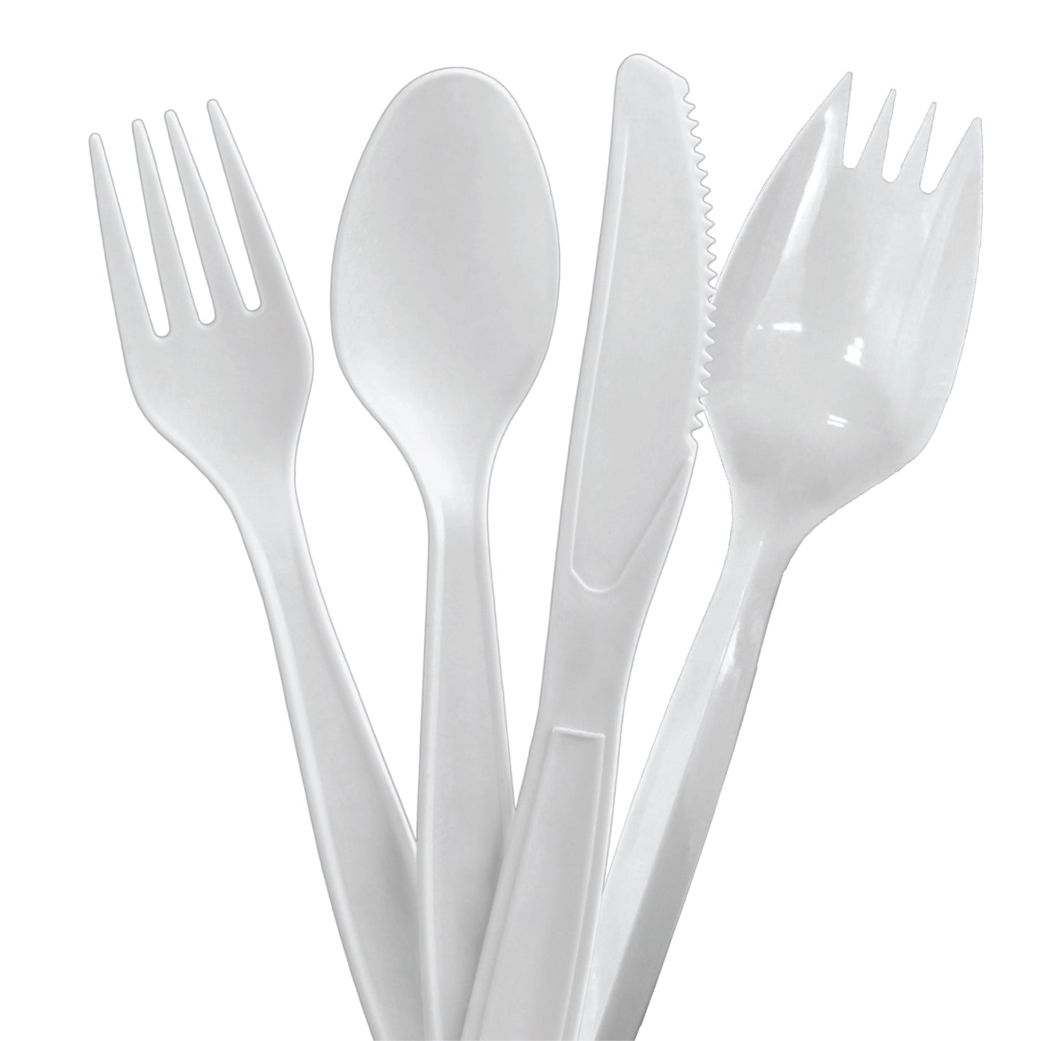 Medium-weight, polystyrene material bulk cutlery, available items include forks, knives, teaspoons, and sporks. These items are white in color, disposable, and great for all Food Service environments.